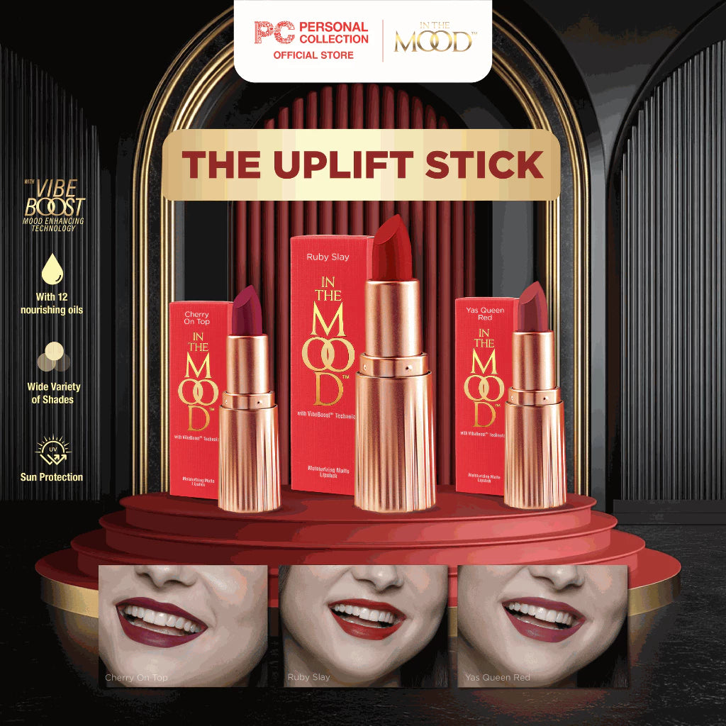Introducing In The Mood Lipstick where beauty meets technology. Infused with VibeBoost formula, this lipstick adds captivating color to your lips and boosts your mood with every swipe.